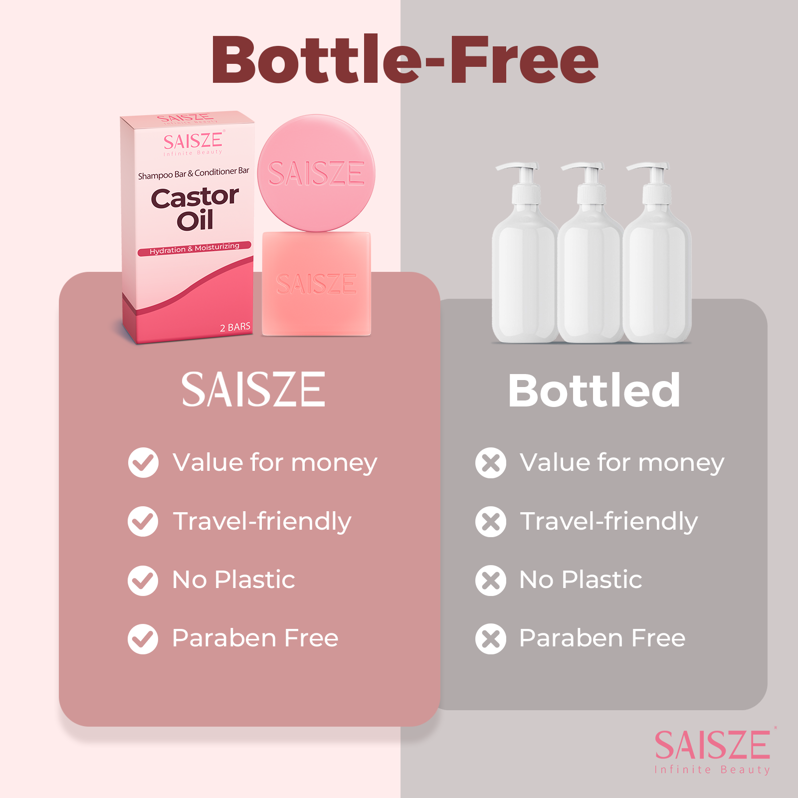 Elevate your haircare routine with SAISZE Castor Oil Shampoo and Conditioner Bars — a luxurious, eco-friendly alternative to bottled products. Infused with nourishing castor oil, pure essential oils, and bio-based ingredients, our bars cleanse, hydrate, and strengthen your hair while restoring natural pH balance. Perfect for dry, brittle, damaged, or color-treated hair, they deeply moisturize, reduce frizz, and promote stronger, shinier locks. Free from sulfates and plastic packaging, these rich, aromatic bars deliver a guilt-free, salon-quality experience at home. Designed for all hair types, each bar lasts up to 2–3 months, making every wash an indulgent, sustainable ritual. Give your hair — and the planet — the care they deserve with SAISZE.